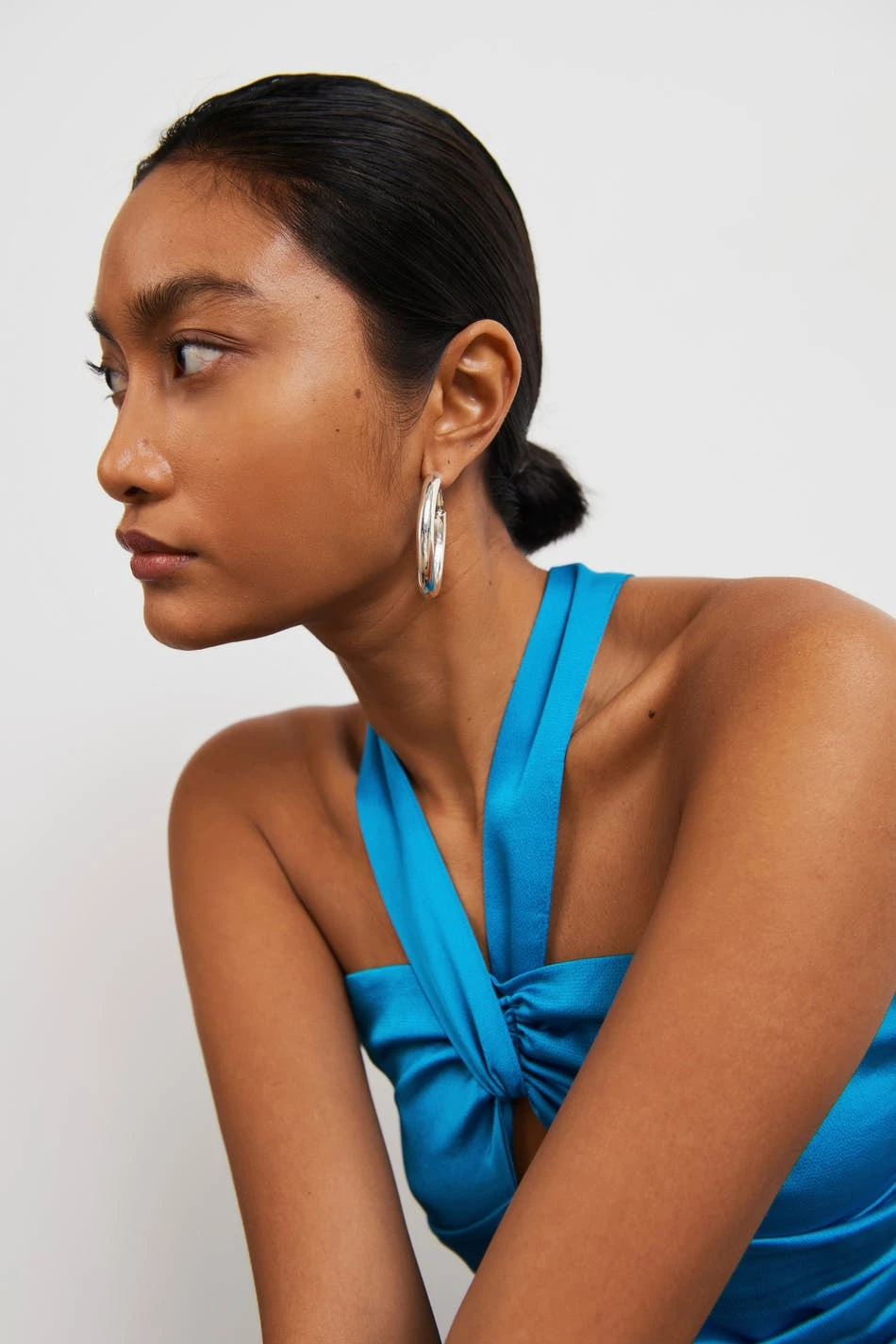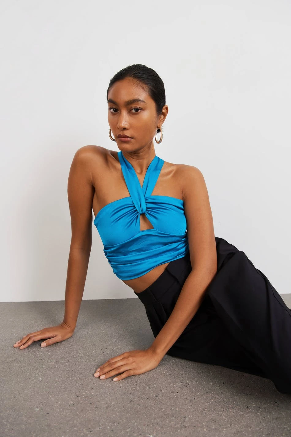 Satin top with crossover straps. The top is perfect for the party, blue and short. It has gathered details, smocking in the back and a fitted fit.