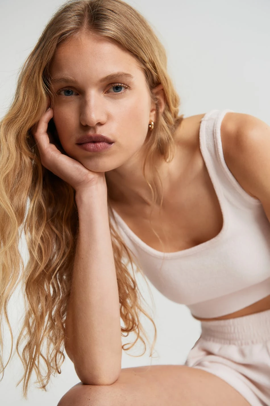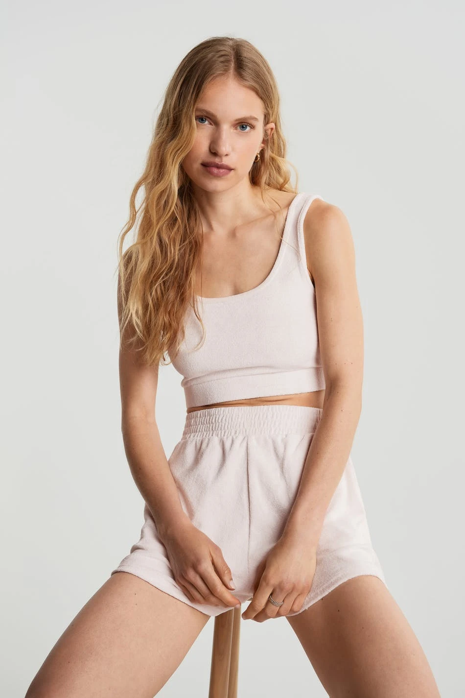 Short top with a fitted fit. The top is pink and has a material in terry.