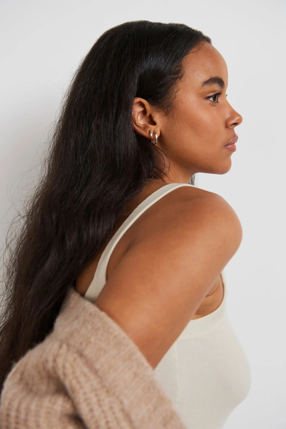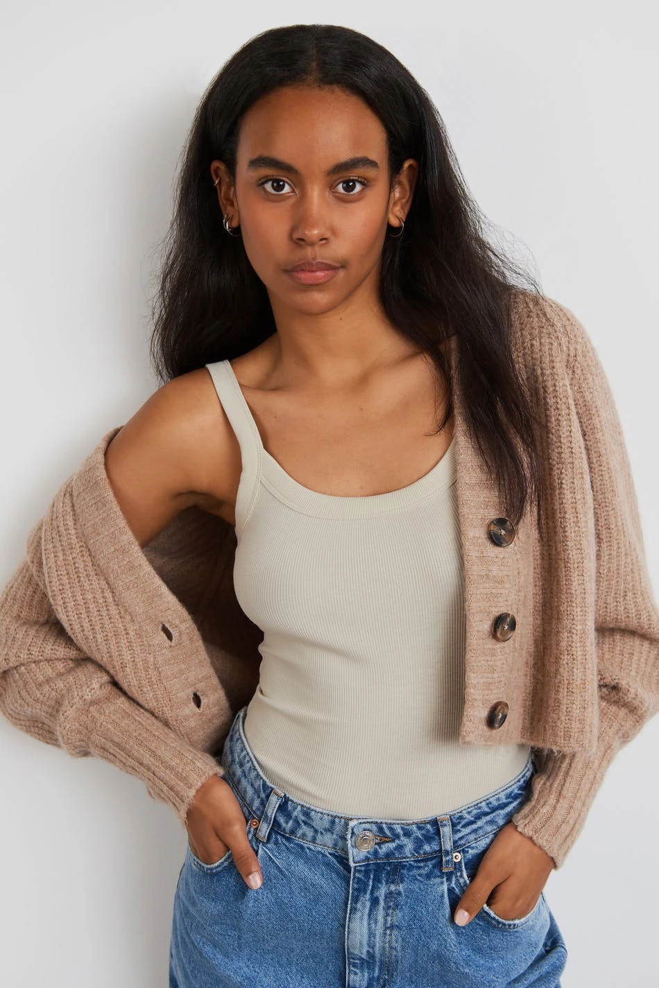 Ribbed tank with a fitted fit. The tank is beige and sleeveless and has ribbed shoulder straps.