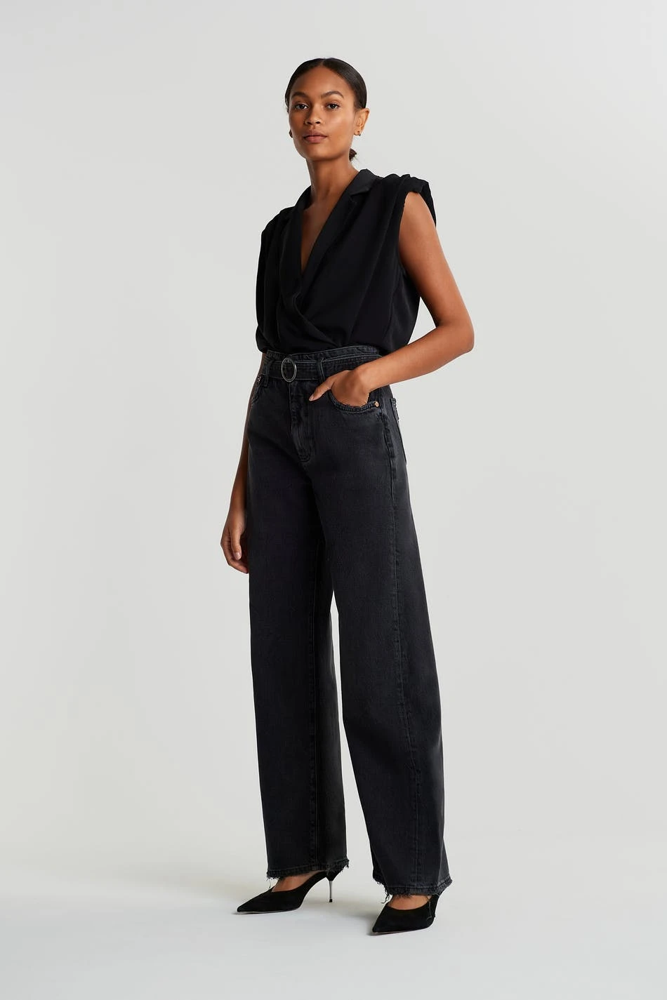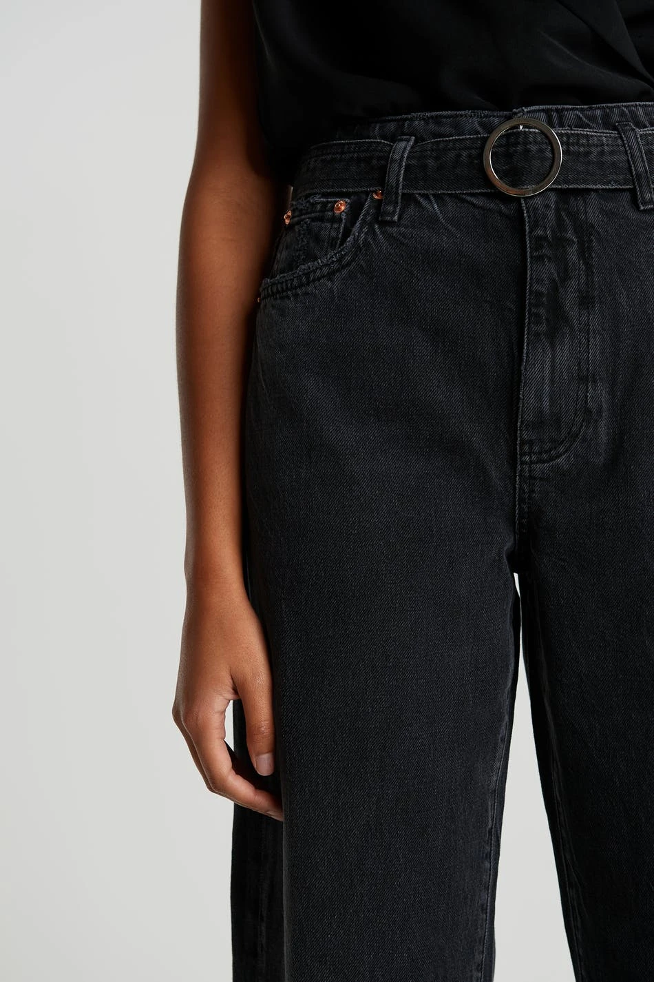 Nonstretch jeans with a regular fit. The jeans are black and have a high waist. They are made of denim and have wide, flared legs and a belt.