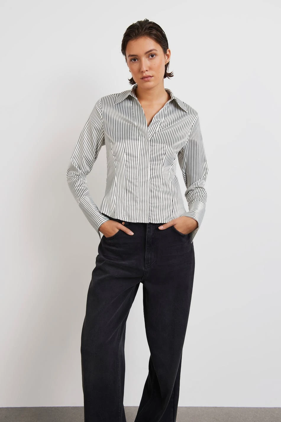 Striped shirt with slim fit. The shirt is white and has soft satin material. It has a collar, seam details at the front, wide cuffs and a hidden button closure at the front.