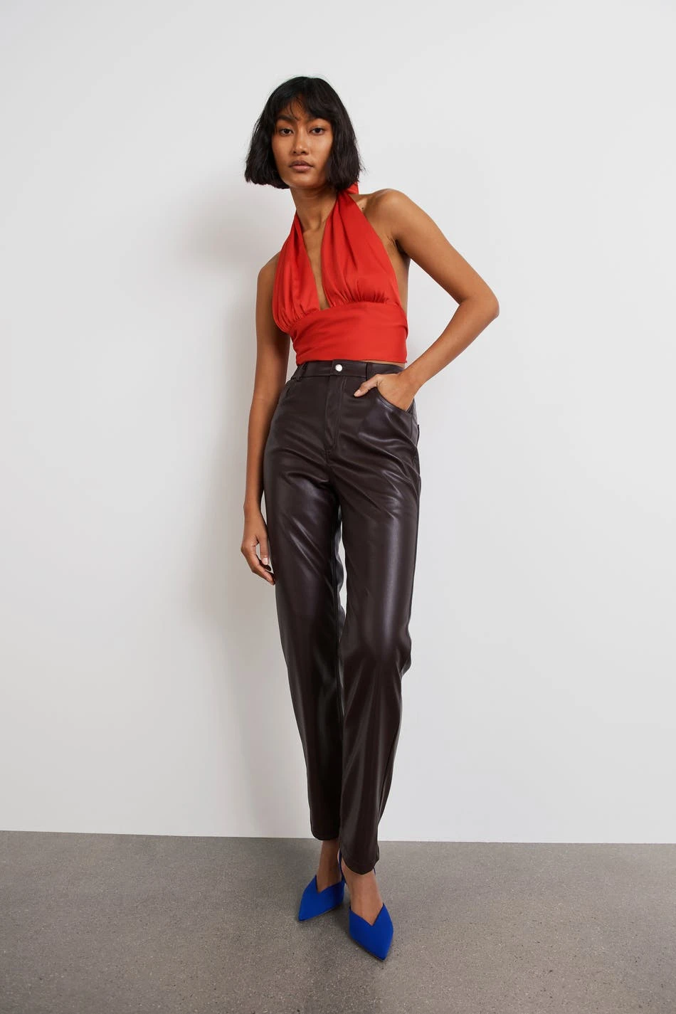 Cropped top with halterneck design. The top is perfect for the party, red and sleeveless. It has an open back, a satin-like material and self-tie in the back. Can be tied in different ways.