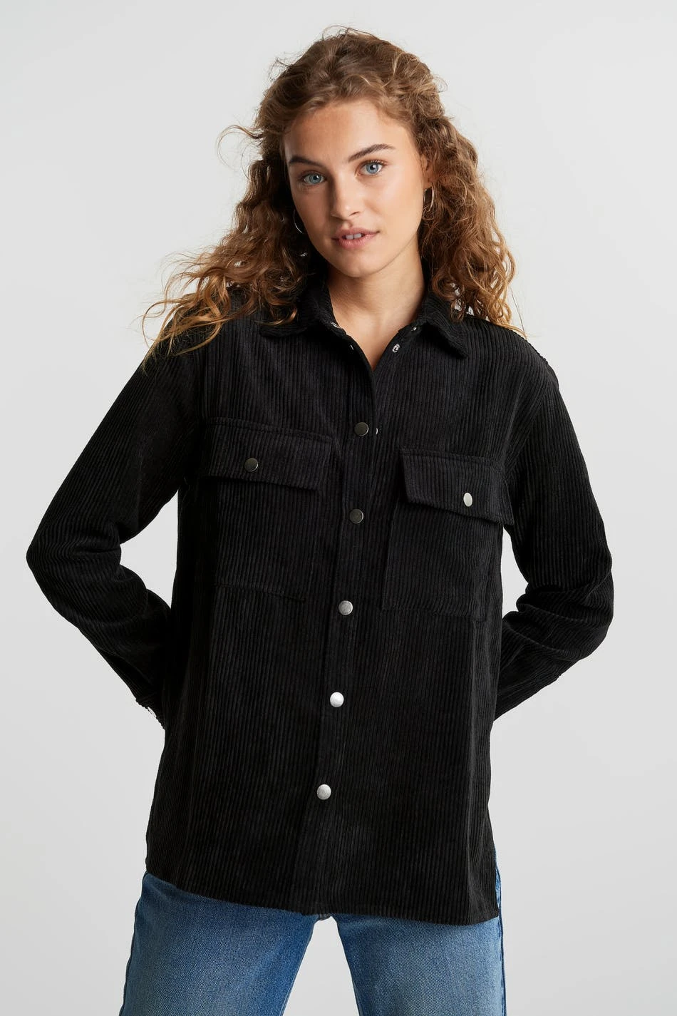 Shirt with corduroy fabric. The shirt is black and has pockets at the front. It has snap buttons.