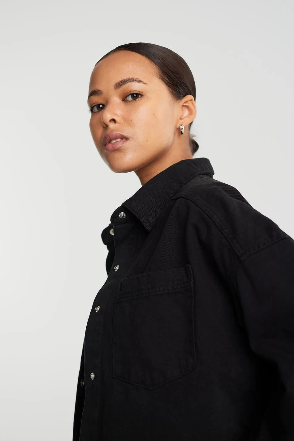 Cropped shirt with an oversize fit. The shirt is black and has snap buttons at the front. It has a chest pocket and a thin material in denim.