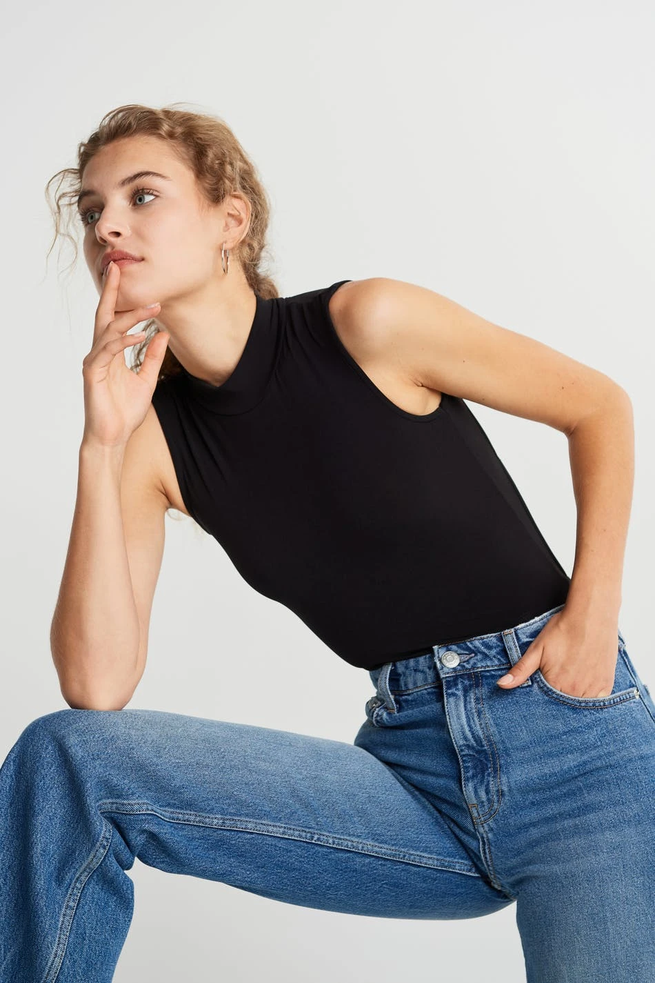 Bodysuit with a fitted fit. The bodysuit is black and has an open back design. It has a turtleneck and a tie strap in the back.
