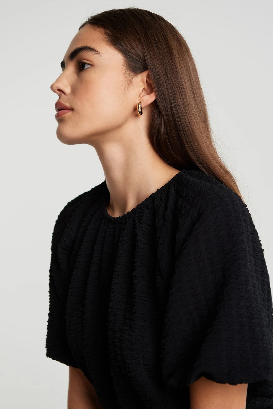 Cropped top with a regular fit. The top is black and has short puff sleeves. It has a treaded material and an elastic band on the sleeve ends and at the hem.