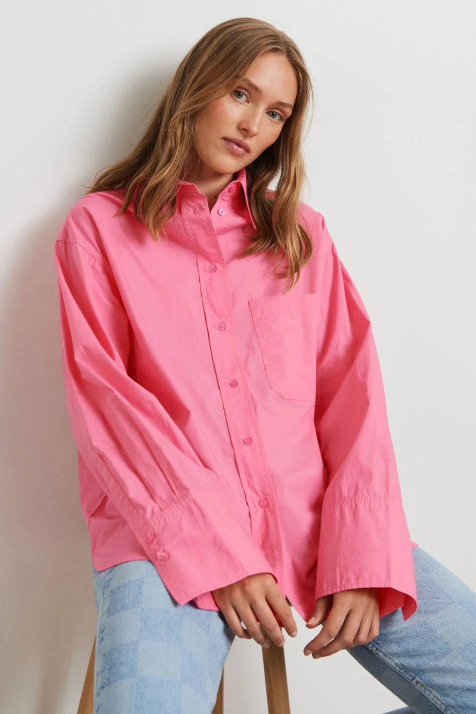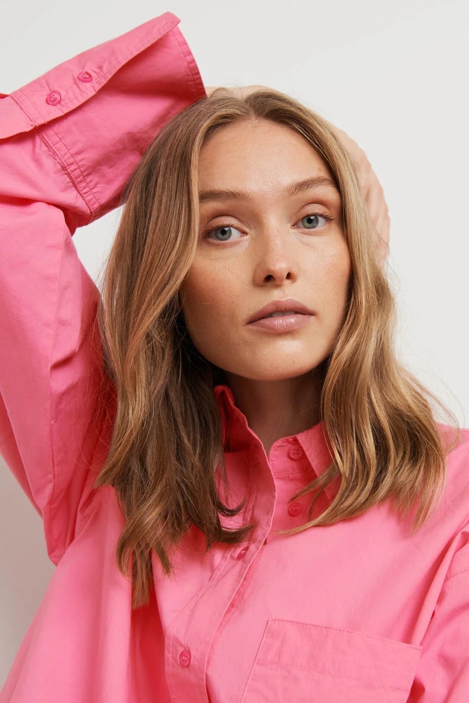 Shirt with an oversize fit. The shirt is pink and has buttons at the front. It is made of poplin and has a chest pocket on one side.