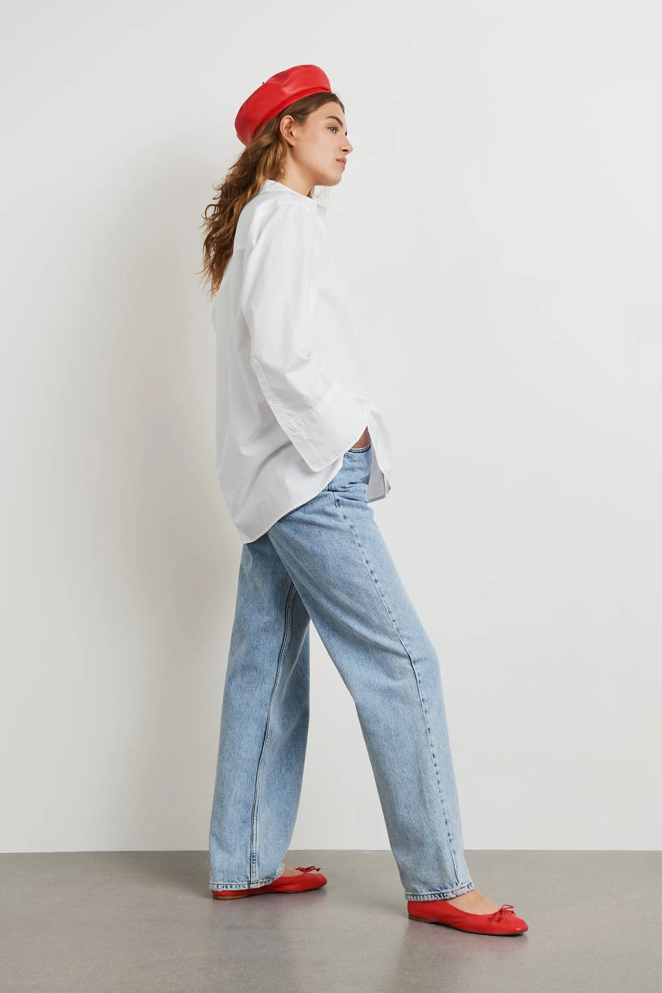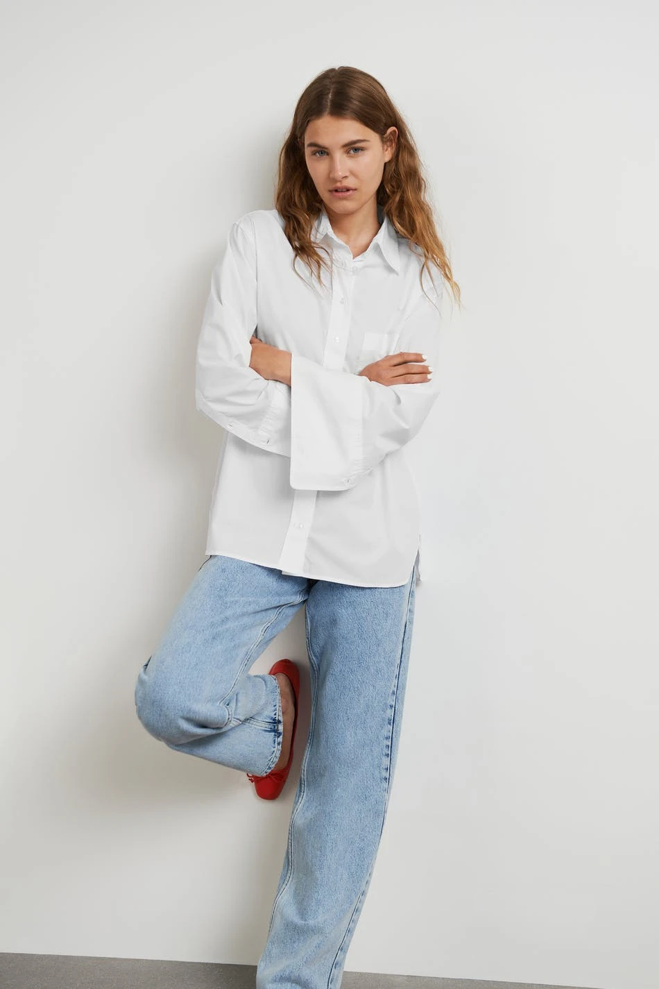 Shirt with an oversize fit. The shirt is white and has buttons at the front. It is made of poplin and has a chest pocket on one side.