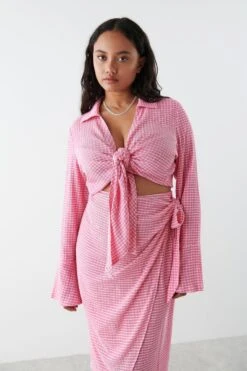 Cropped top with a halterneck design. The top is perfect for the party and yellow and has a treaded material in satin. It has a fitted fit, a self-tie in the back, ruching at the waist and an opening at the front.
