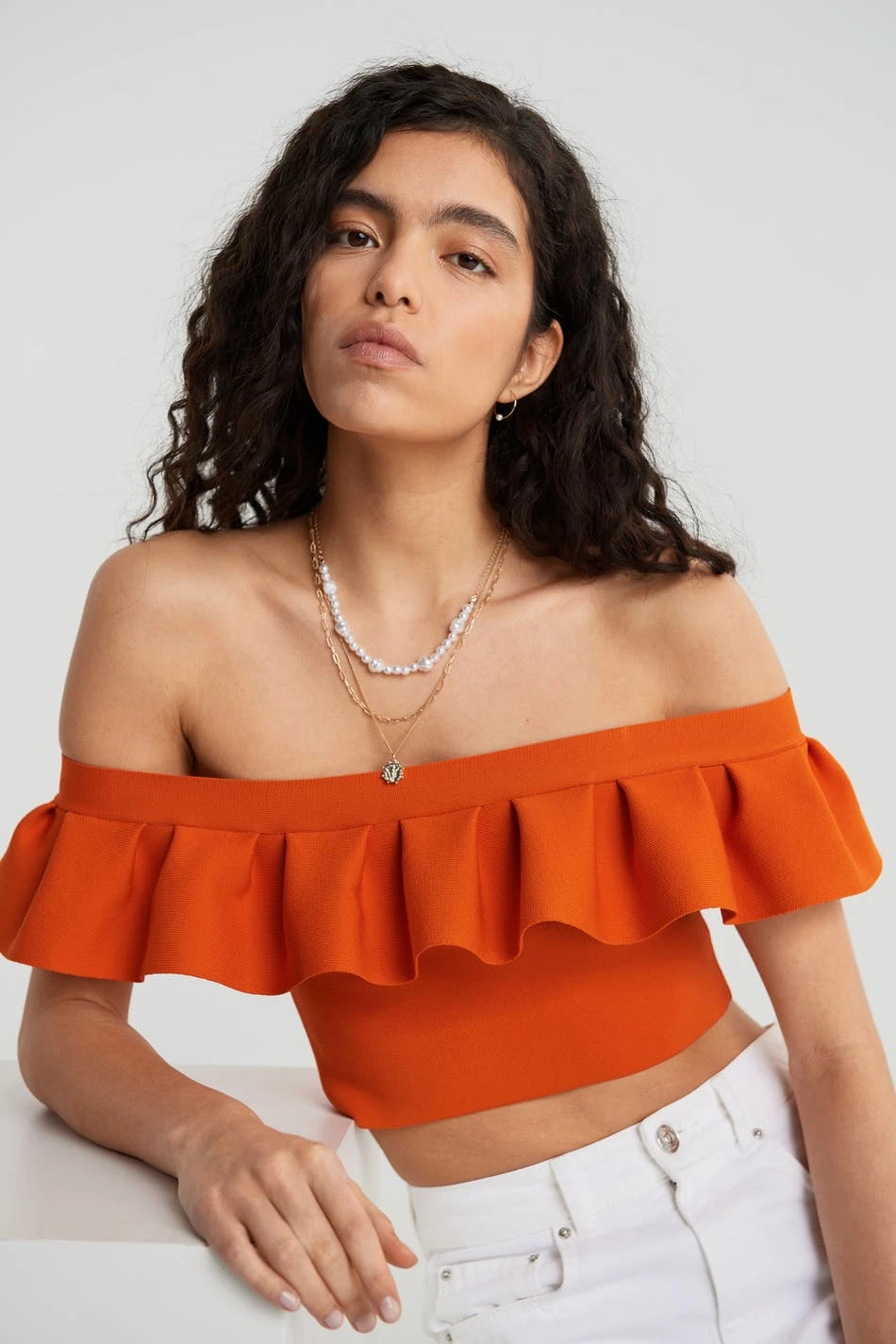Off shoulder top with a frill at the top. The top is orange and has a cropped length.