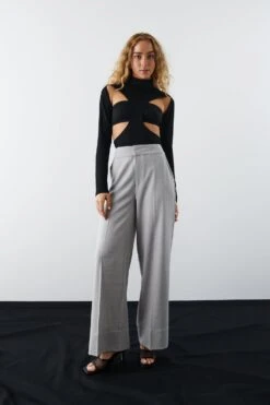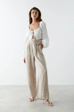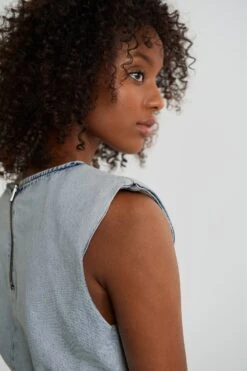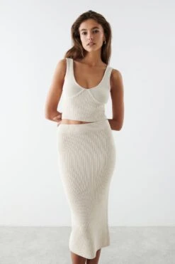 Short tank with a fitted fit. The tank is beige and has an open back design. It is made of jersey and has a lining at the front and an elastic band at the hem.
