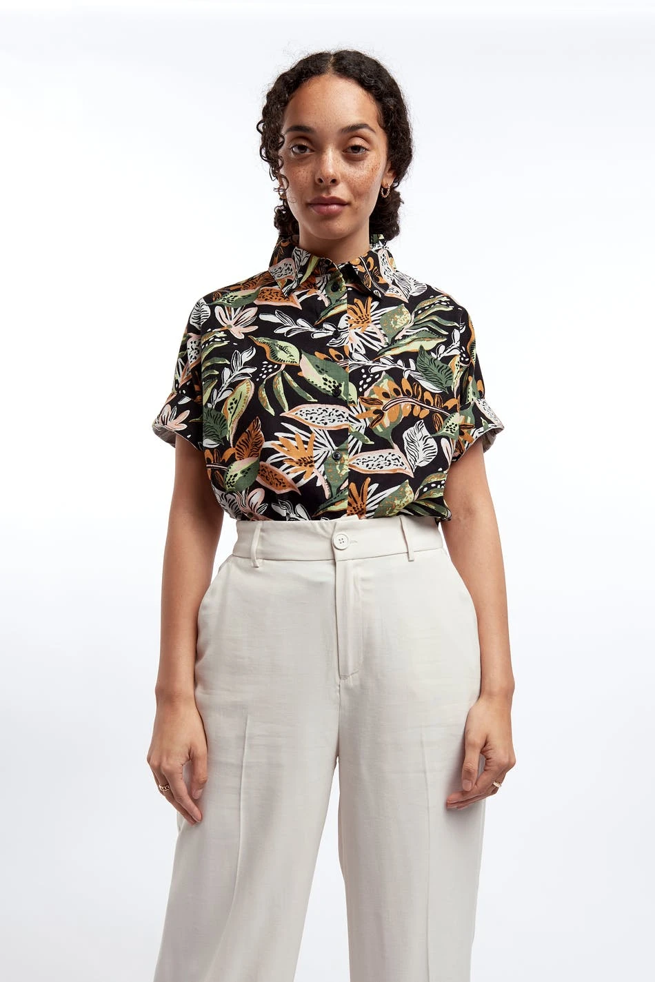 Womens button down shirt with short sleeves. Sewn pleat at back. Supplier: Globus Garments Ltd Production unit: Globus Garments Ltd