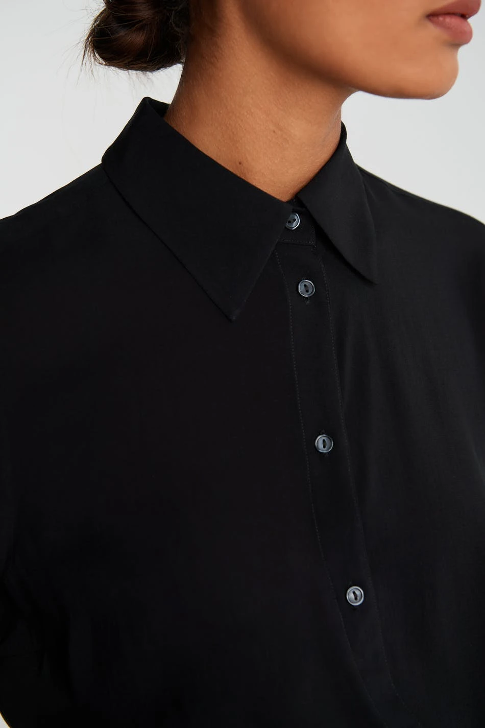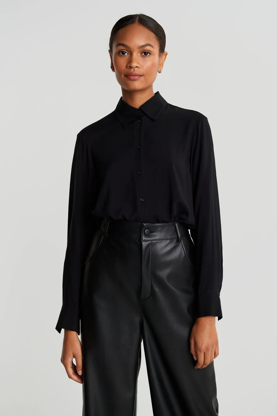 Soft shirt with long sleeves. The shirt is black and slightly longer at the back.