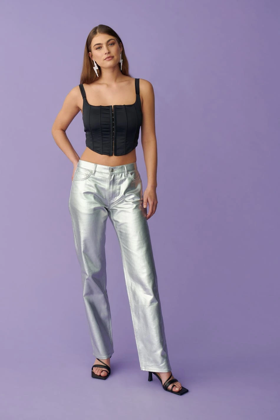 Corset top with hook-and-eye closure at the front. The top is perfect for the party and black and has square neckline. It has shoulder straps and stretchy quality.
