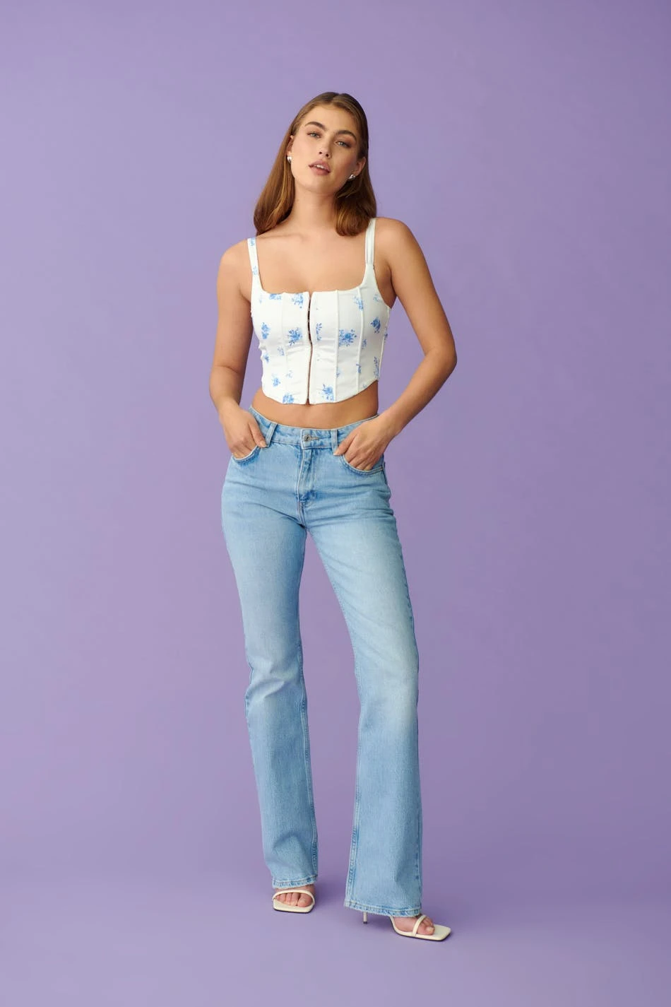 Corset top with hook-and-eye closure at the front. The top is perfect for the party, blue and white. It has square neckline, shoulder straps and stretchy quality.