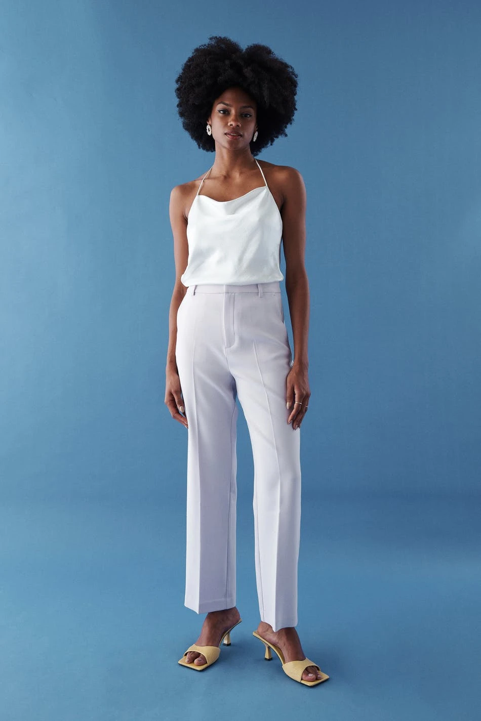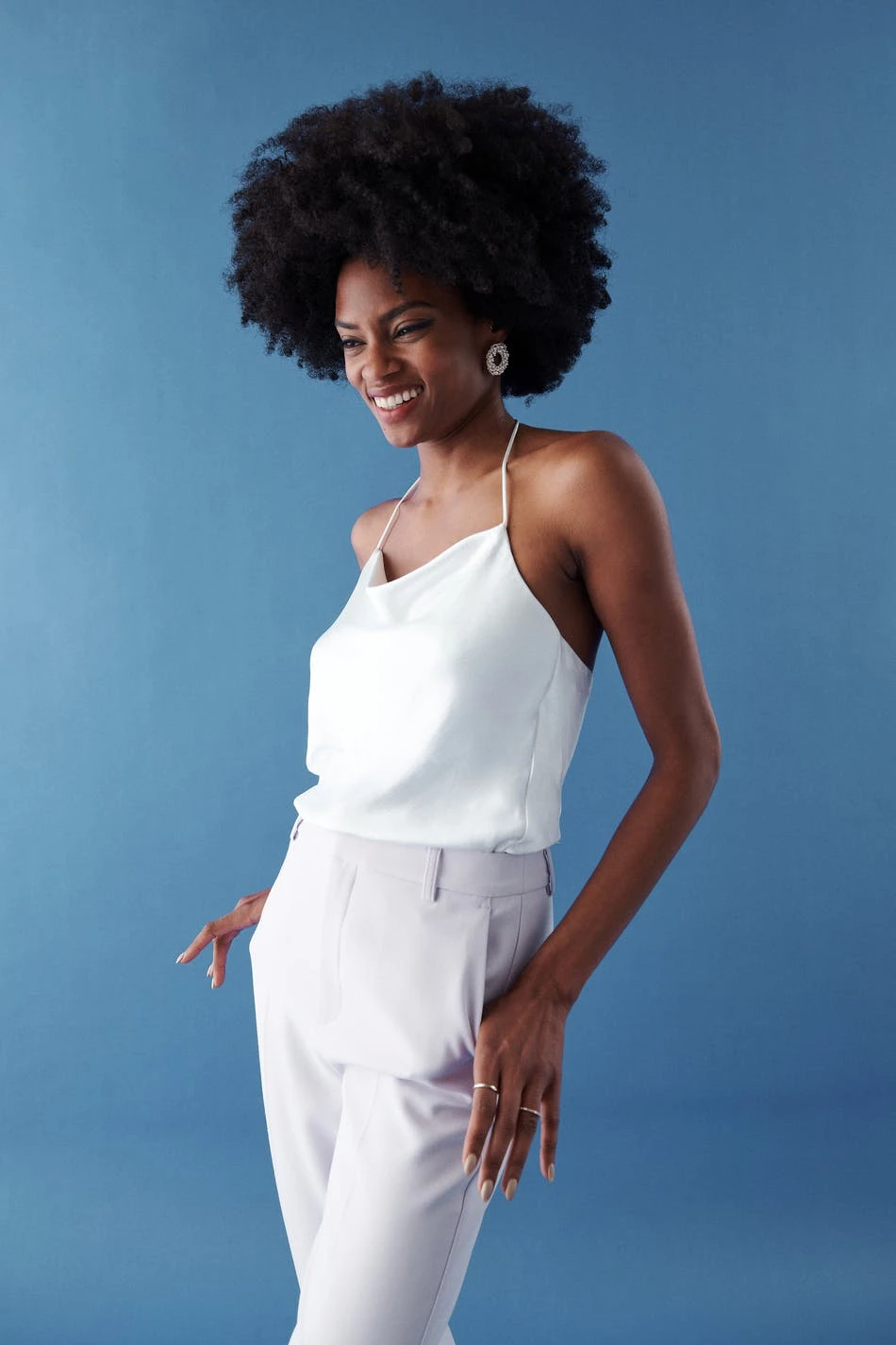 Tank in satin with cowl neck. The tank is perfect for the party and white and has an open back. It has thin halterneck straps.