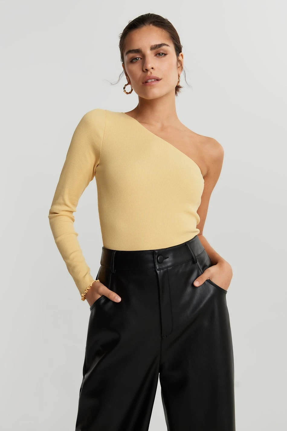 Off-the-shoulder top with a fitted fit. The off-the-shoulder top is yellow and has a one shoulder design. It has a long sleeve.