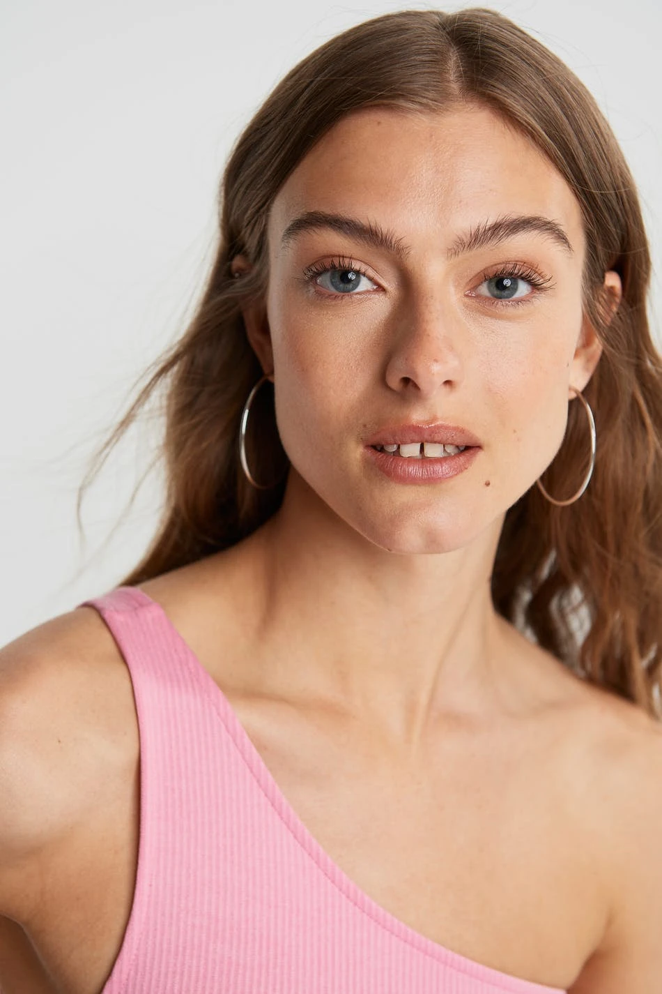 Rib-knit top with a fitted fit. The top is pink and has a one shoulder design. It is made of jersey.