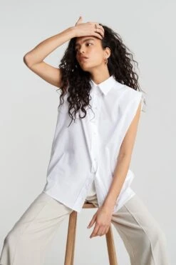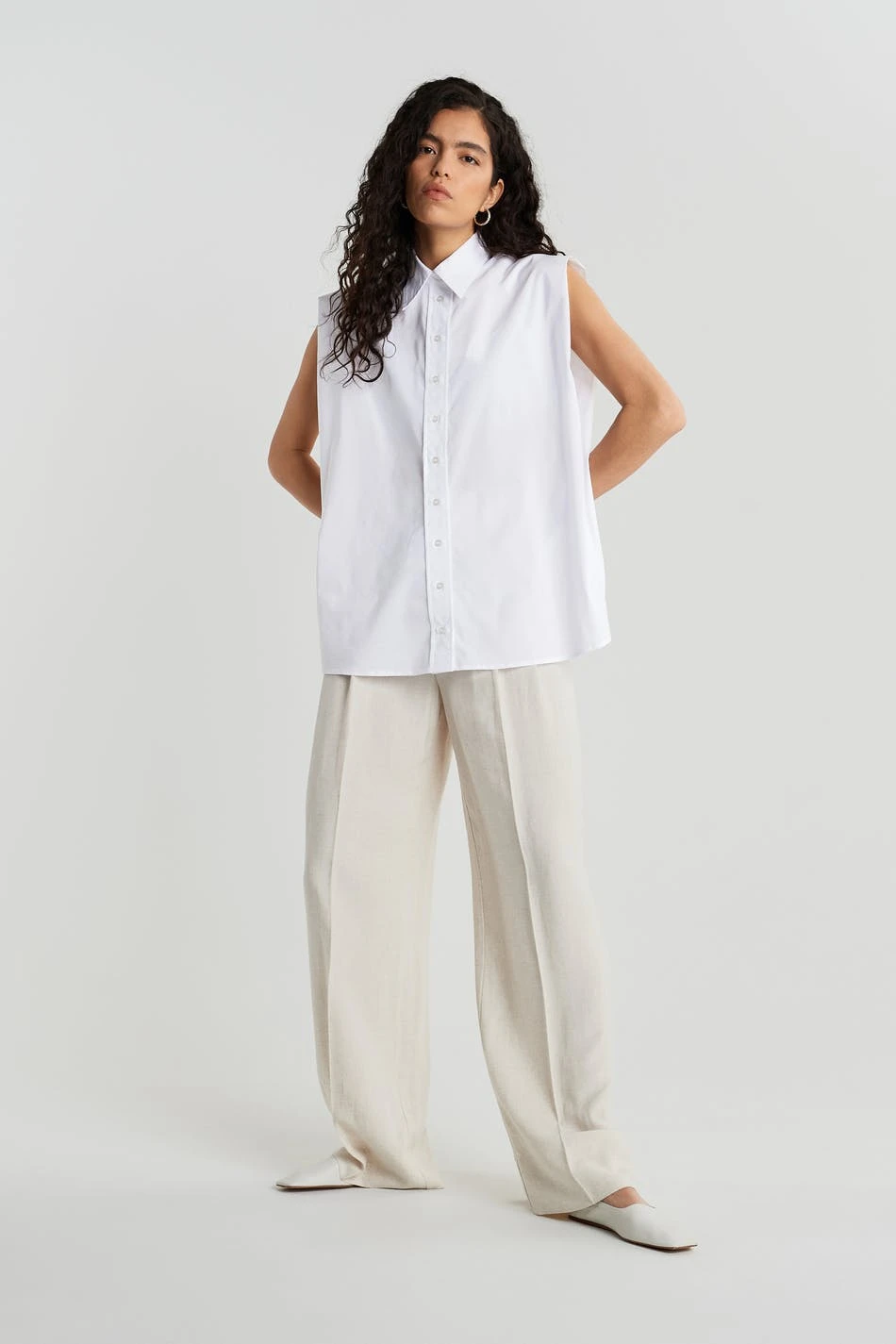 Sleeveless shirt with a straight, oversize fit. The shirt is white and has defined shoulders.