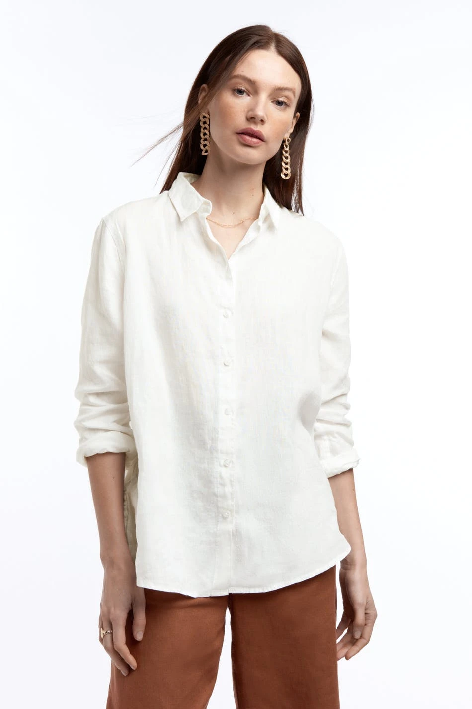 Long-sleeved shirt with a straight fit. The shirt is white and has a turn-down collar. It is made of linen and has buttons at the front and a rounded hem.