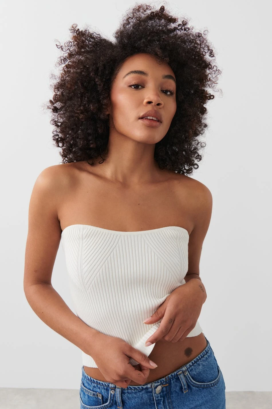Knitted tube top with figure-hugging fit. The top is white and has sweetheart neckline. It has fully-fashioned sections at the front and a ribbed quality with stretch.