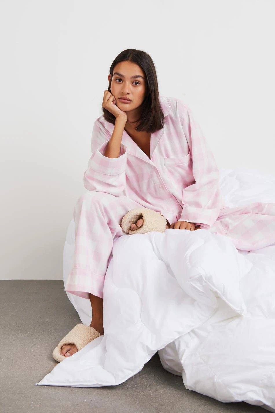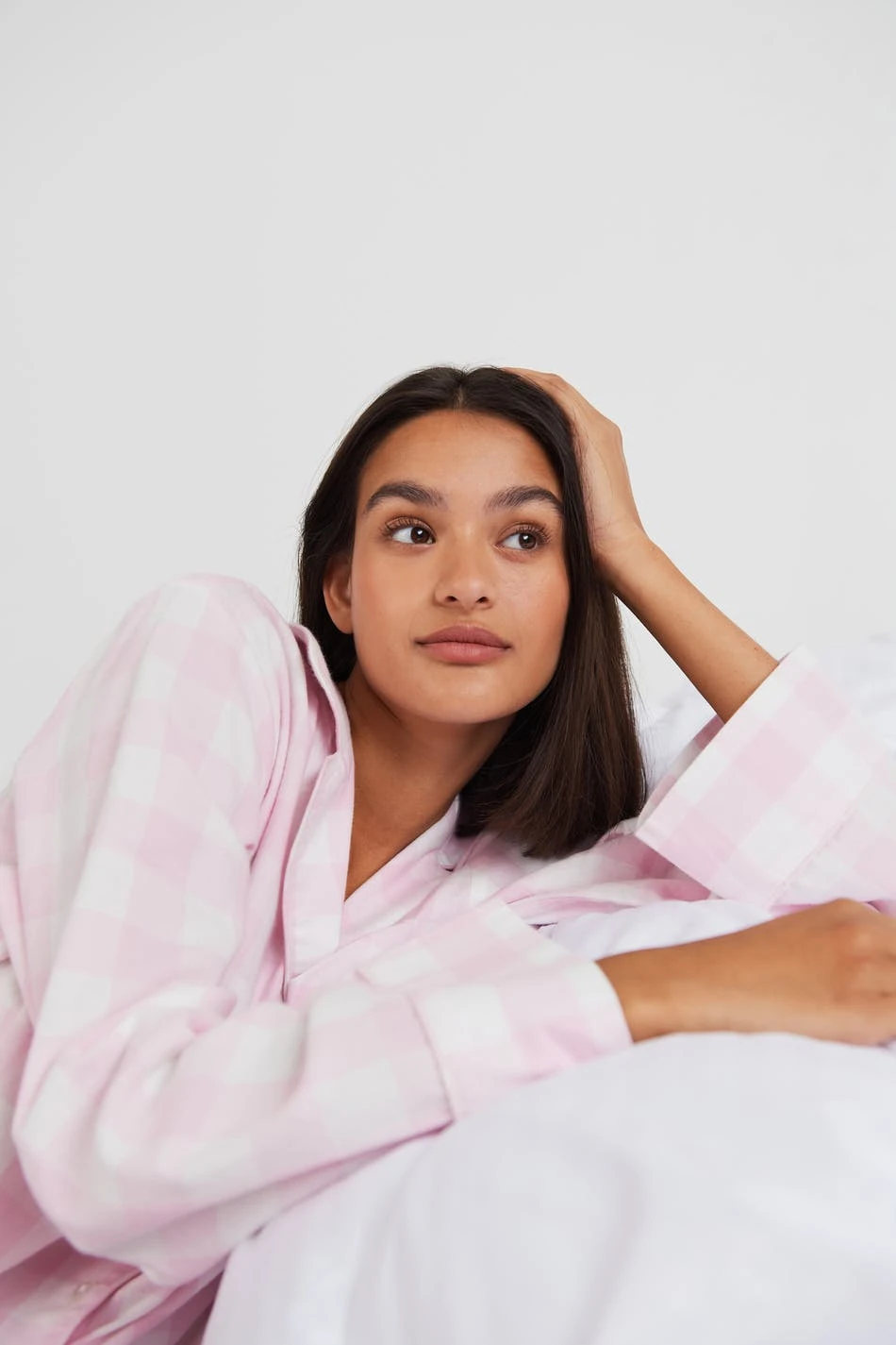Checked pyjama shirt with an oversize fit. The shirt is pink and has a soft material in cotton. It has a collar, a chest pocket and a button closure at the front.