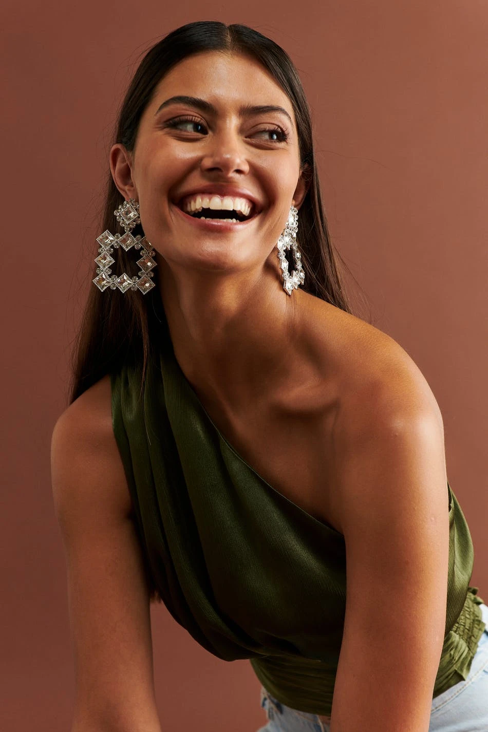 Cropped one shoulder top in satin with gathered effect. The top is perfect for the party, green and sleeveless. It has smocking at the back and a crinkled material.
