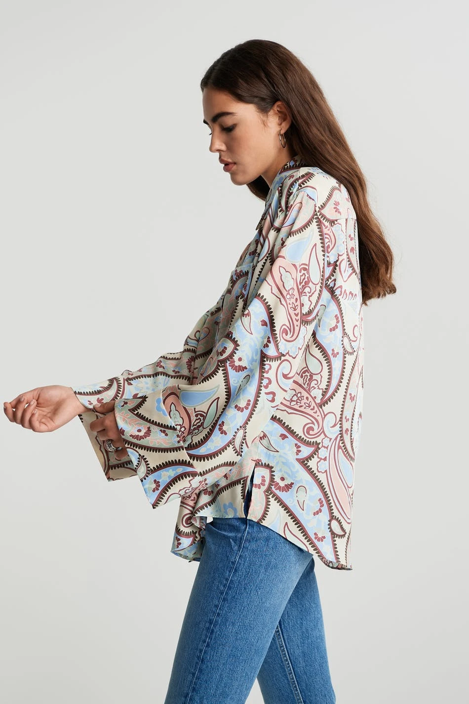 Shirt with a paisley pattern and long, spacious sleeves with a slit on the sleeve ends. Blue, beige, pink and green. It has a satin-like material.