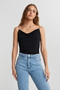 Sleeveless top with a regular fit. The top is perfect for the party and black and has thin shoulder straps. It has a ruched neckline.