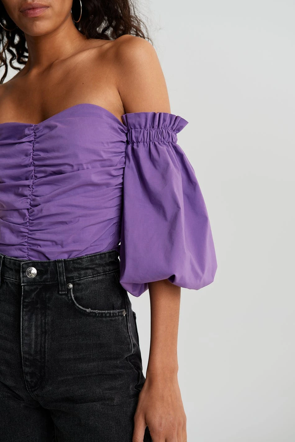 Woven offshoulder top with long balloon sleeves. Gathering at center front. Supplier: Huzi Tekstil Ltd Sti Production unit: Yesim Tekstil-Hulya Karacoban
