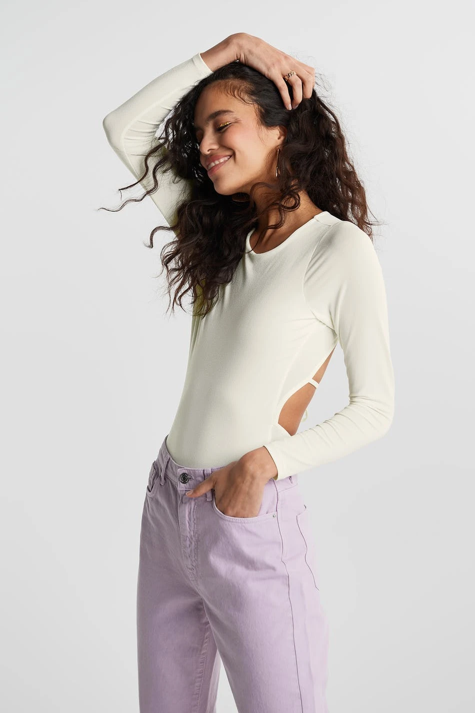 Long-sleeved body with a fitted fit. The body is perfect for the party and white and has an open back design with a tie strap in the back.