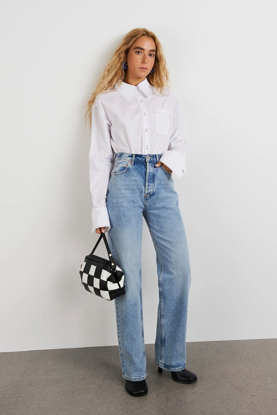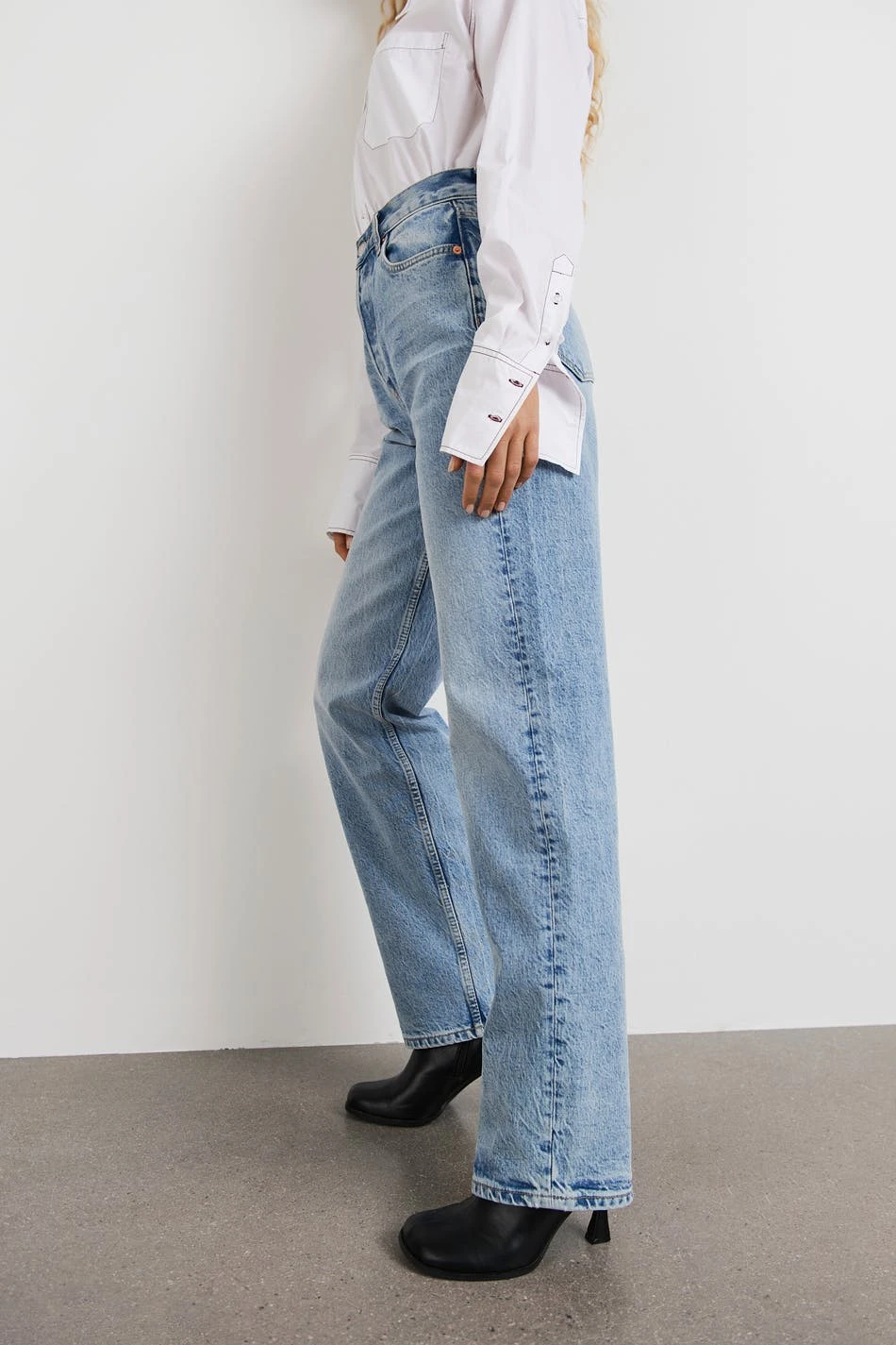 Hobnob X Gina Tricot. Straight jeans with a regular fit. The jeans is blue and has a high waist. It is made of denim and has straight, long trouser legs, low stretch and pockets at the front and back.