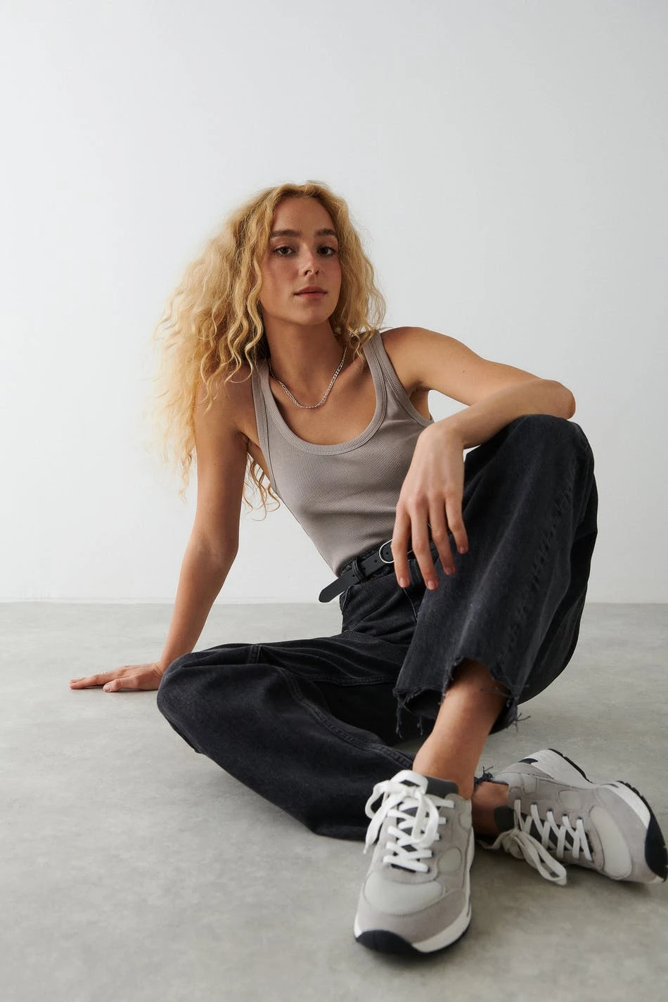Ribbed tank with a fitted fit. The tank is beige and has a normal length.