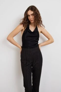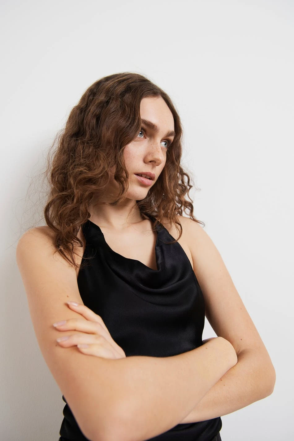 Satin halterneck top with draped neckline. The top is perfect for the party and black and has a self-tie at neck.