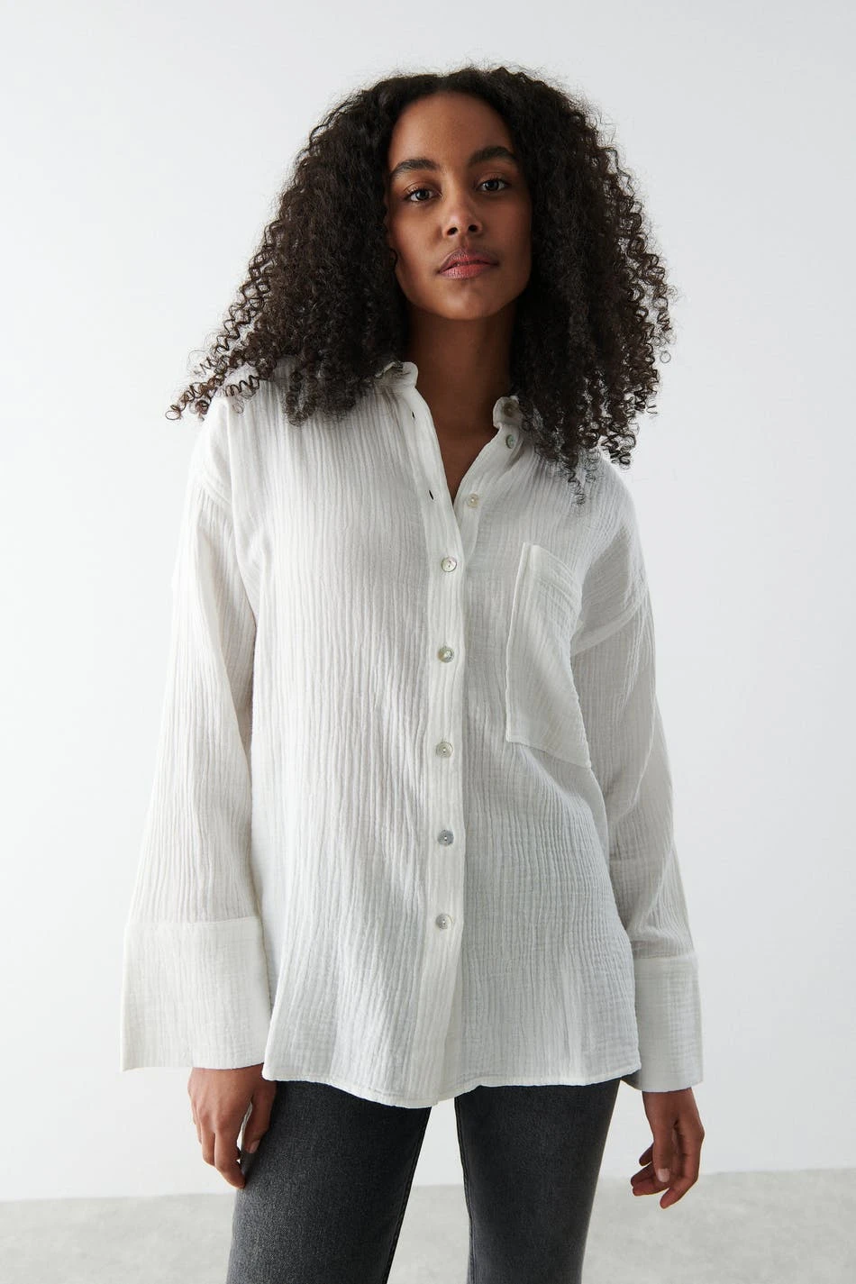 Shirt with a chest pocket. The shirt is white and has button placket in front. It has collar, wide cuffs with button placket, vent in the sides and a structured material in cotton.