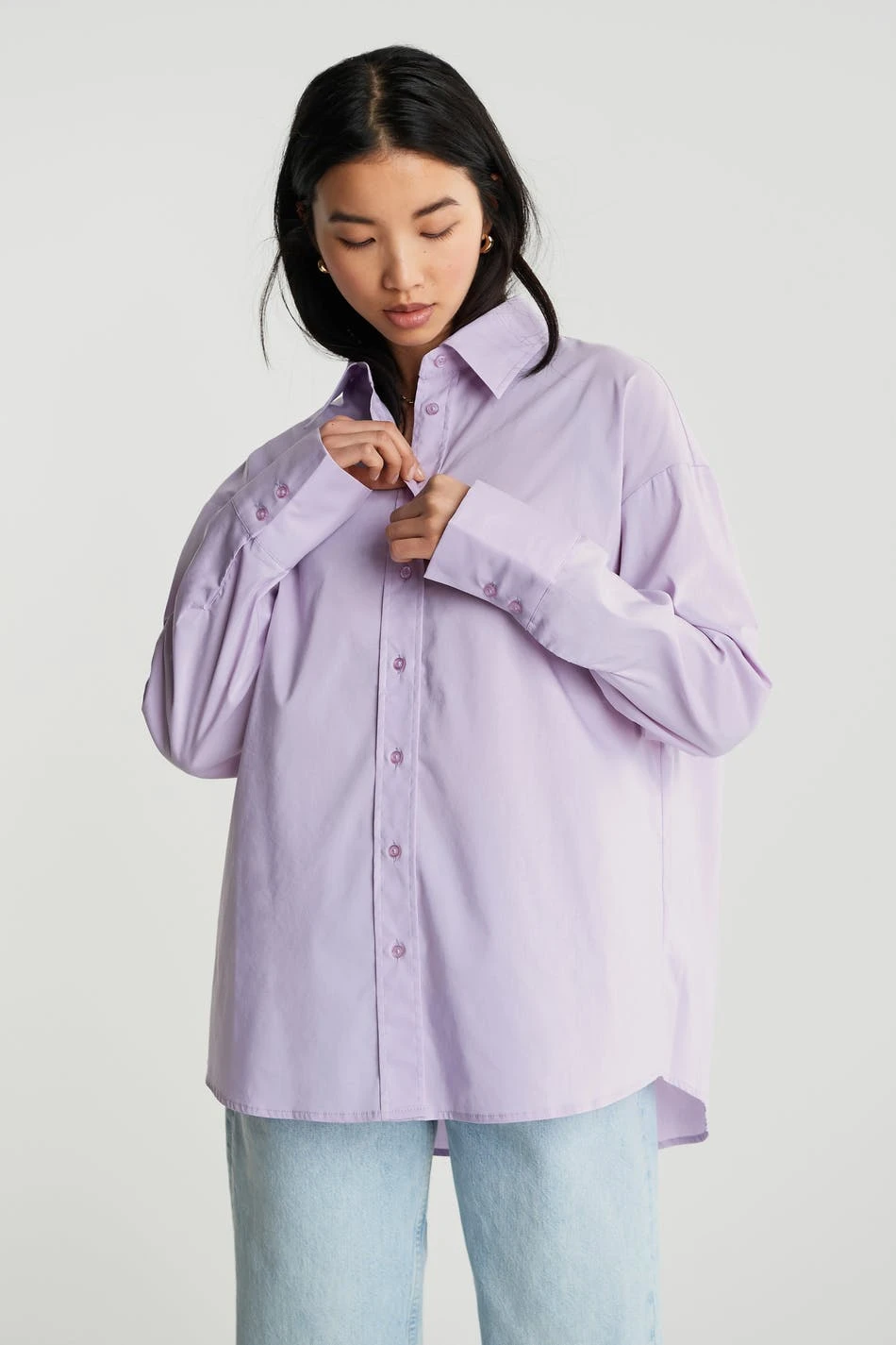 Oversize shirt with buttons at the front. The shirt is purple and slightly longer.