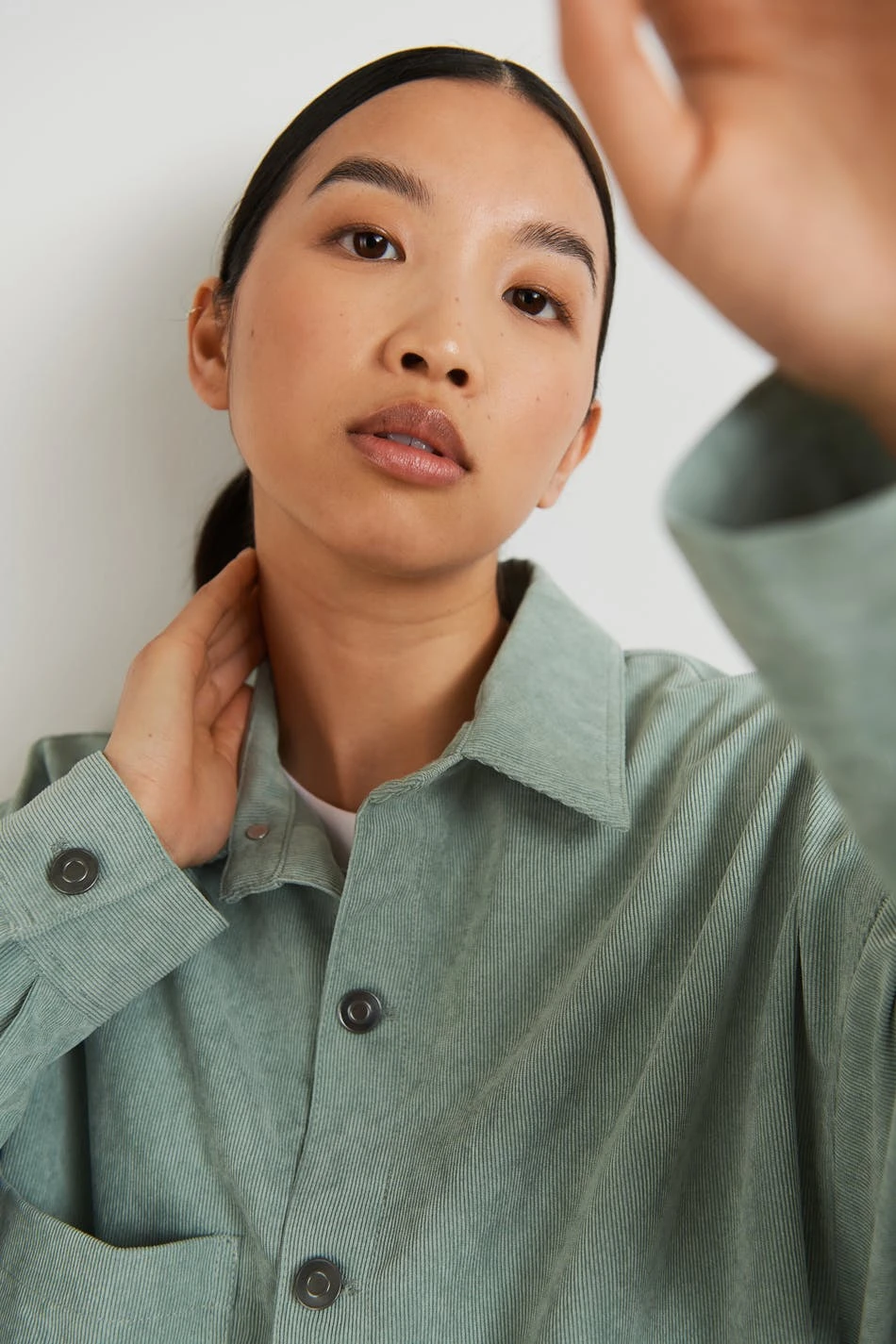 Oversized shirt with a relaxed fit. The shirt is green and has a chest pocket on one side. It is made of corduroy and has a button closure at the front.