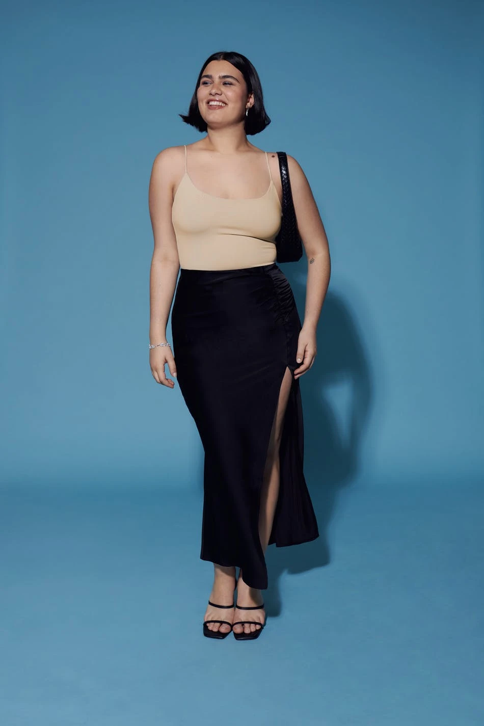 Bodysuit in jersey with string at the back. The bodysuit is beige and has thin shoulder straps. It has figure-hugging fit and buttoning at the crotch.