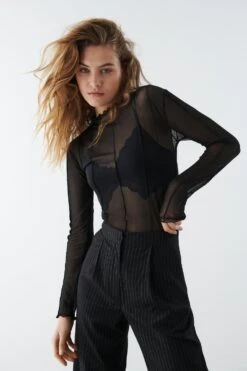 Mesh top with ruffle details. The top is perfect for the party and black and has a fitted fit.