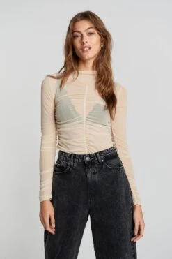 Long-sleeved top with a fitted fit. The top is perfect for the party, beige and fitted. It is made of mesh and has mesh fabric and ruching at the front, at the back and along each sleeve.
