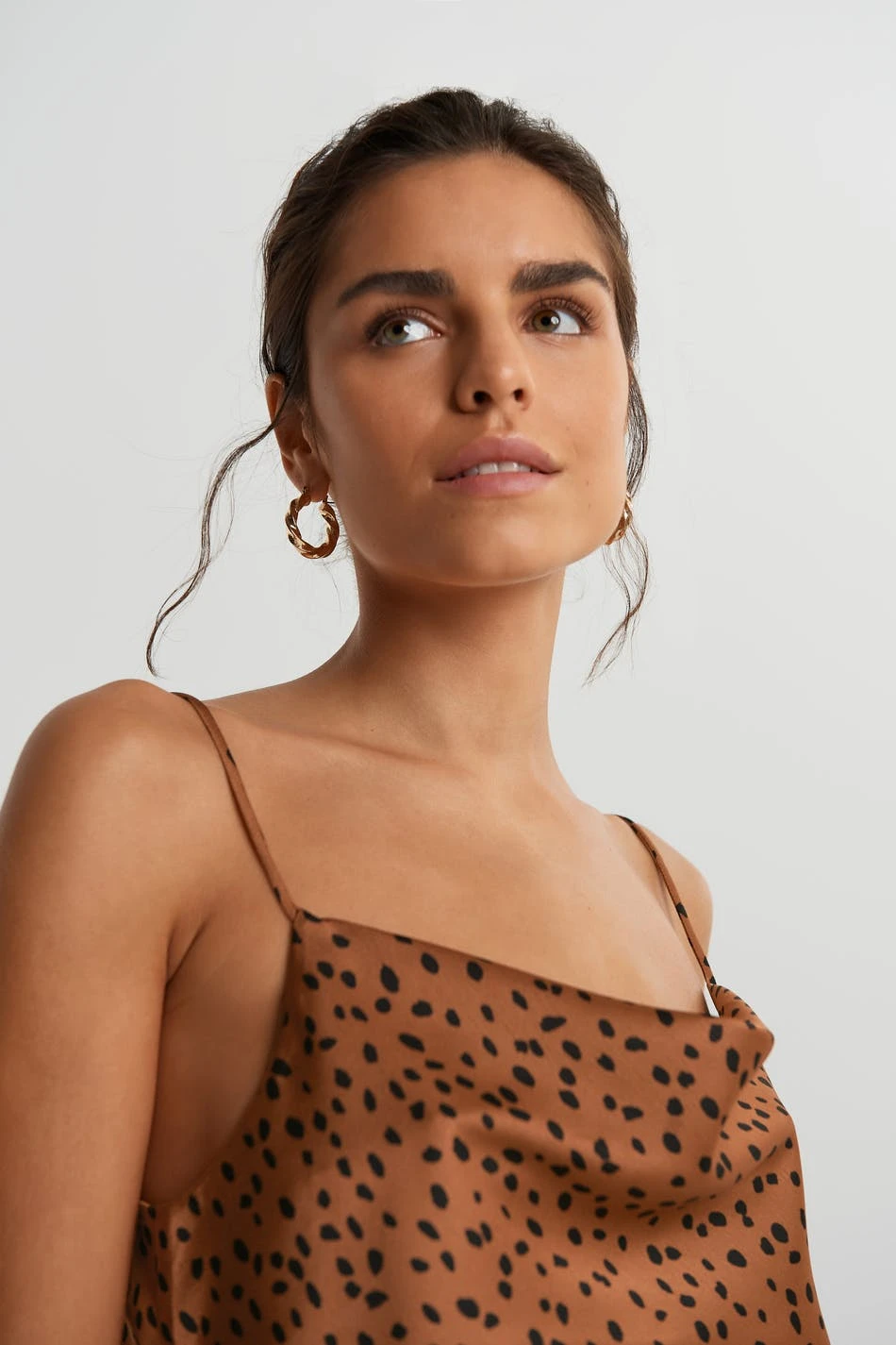 Top with a regular fit. The top is perfect for the party and brown and has a draped neckline.