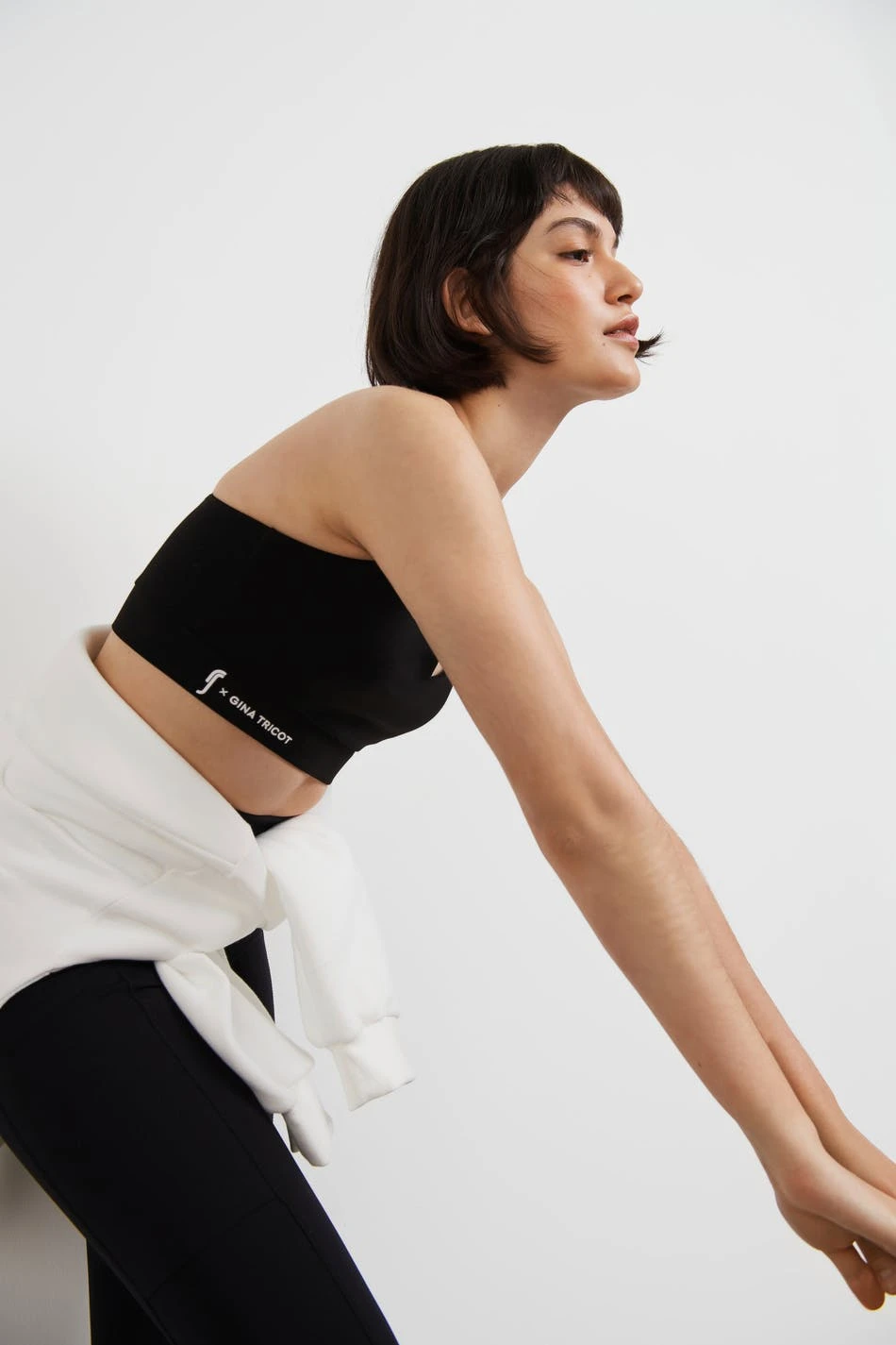 RS X Gina Tricot. Workout top with a fitted fit. The top is black and has a V-neck. It has a cropped length, crossover straps in the back and a printed logo at the front.